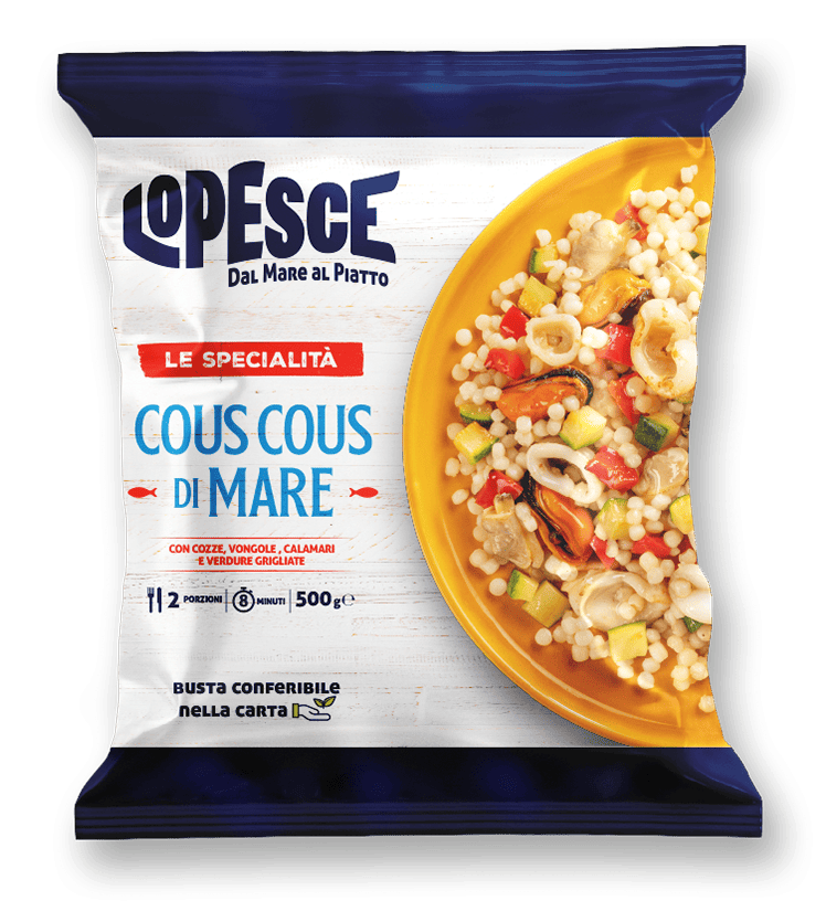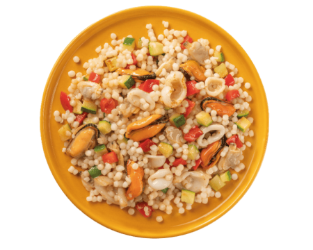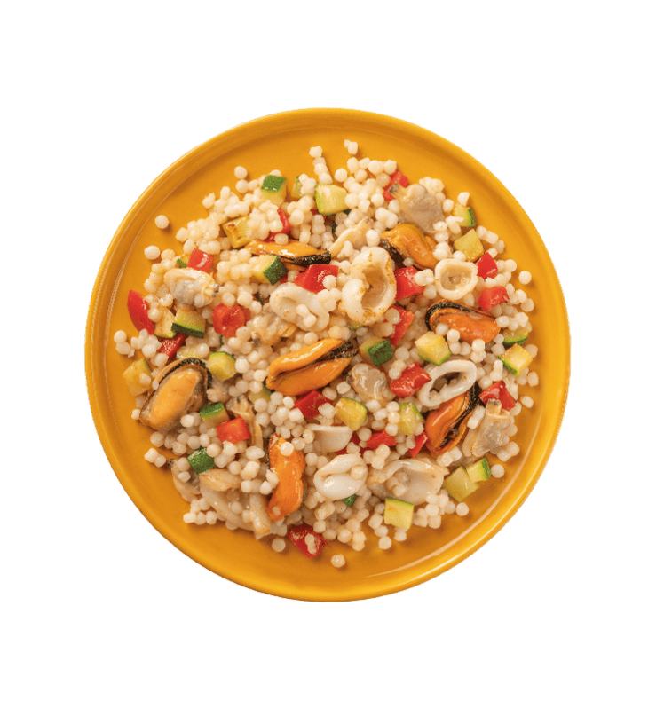 We’ve combined light couscous with grilled zucchini and bell peppers, enriched with the authentic flavors of our sea: mussels, clams, and squid.